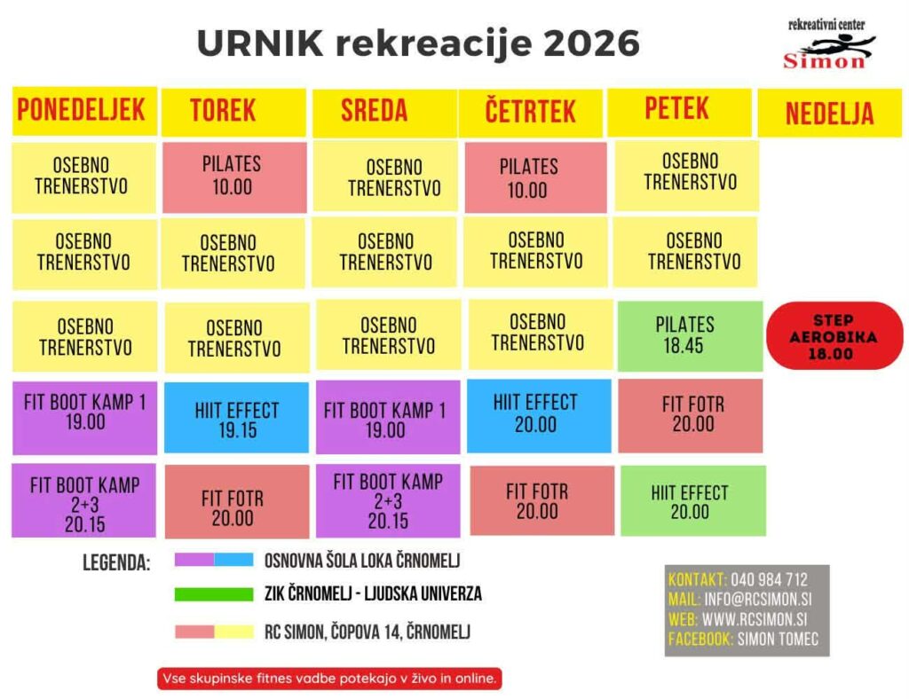 URNIK FITNES STUDIA Ponedeljek: 6.00 – 22.00Torek: 6.00 – 22.00Sreda: 6.00 – 22.00Četrtek: 6.00 – 22.00Petek: 6.00 – 22.00Sobota: 6.00 – 22.00Nedelja: 6.00 – 22.00Za prvi obisk se je potrebno predhodno najaviti. Kontakt OSEBNO TRENERSTVO FIT BOOT KAMP 1 FIT BOOT KAMP 2 ANTICELULITNI PROGRAM HIIT EFFECT PILATES COACHING ZA ŠPORTNIKE